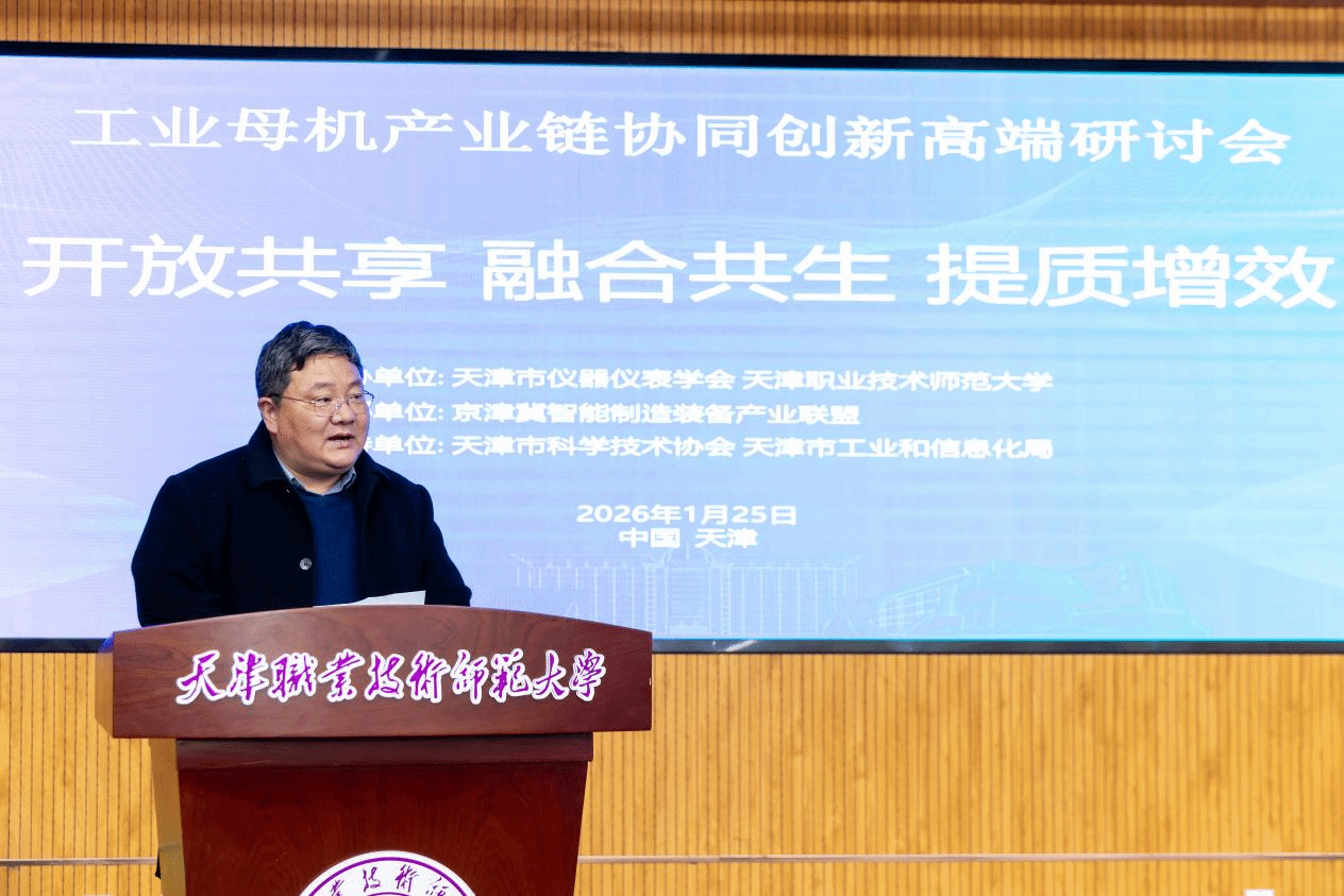 本网讯【通讯员 郭蕾 魏兵】1月25日,由我校联合天津仪器仪表学会主办,天津市智能制造装备产业协会协办的“工业母机产业链协同创新高端研讨会”在师资培训楼一楼报告厅成功举办。中国工程院院士、浙江大学求是特聘教授谭建荣出席并做主旨报告。天津市科协学会部部长王黎明,天津市工信局装备处副处长武文枫,我校党委副书记、校长、天津市仪器仪表学会理事长郑清春出席并致辞。我校党委常委、副校长蔡玉俊,副校长王劲松,天津市天锻压力机有限公司总经理刘林志,天津市自动化学会副理事长王显明,天津市京津冀智能制造装备产业联盟秘书长张欢喜等出席。研讨会由天津市仪器仪表学会秘书长郑宝山主持。