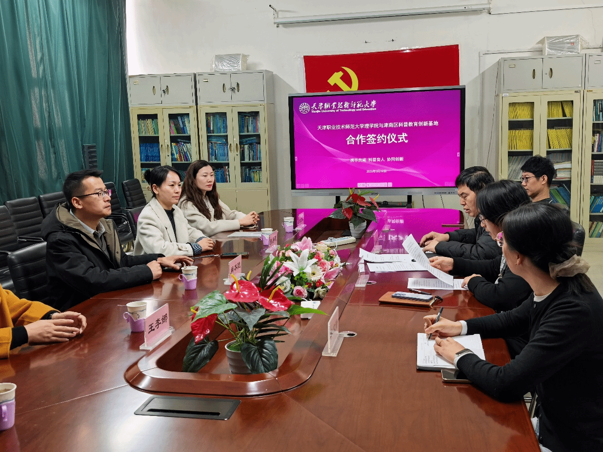 本网讯【通讯员 李文静】3月12日,理学院与津南区科普教育创新基地举行合作签约仪式。津南人力发展产业促进会创投部部长张小花,理学院院长孙福芹、实验教学中心主任屠炜巍、办公室主任李文静,海棠花企业家俱乐部代表肖本陇、科学素养项目主理人宗彦红、投资人王李娜出席活动。理学院副院长盛朝霞主持会议。